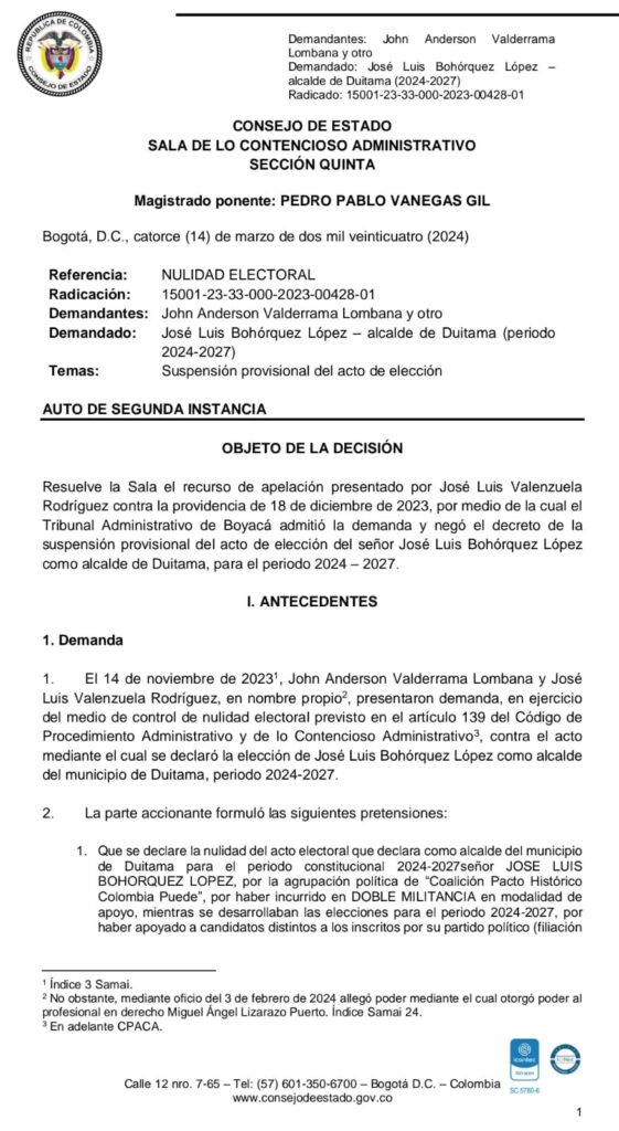 Consejo de Estado ordena la suspensión del alcalde de Duitama, José Luis Bohórquez, por haber incurrido en doble militancia en modalidad de apoyo.