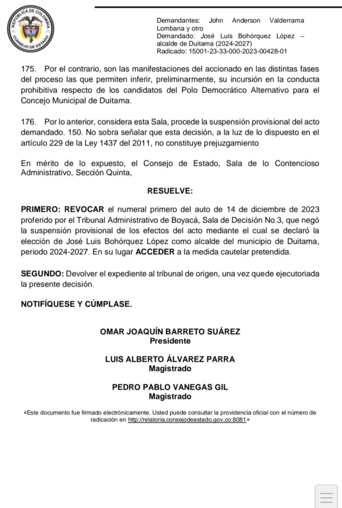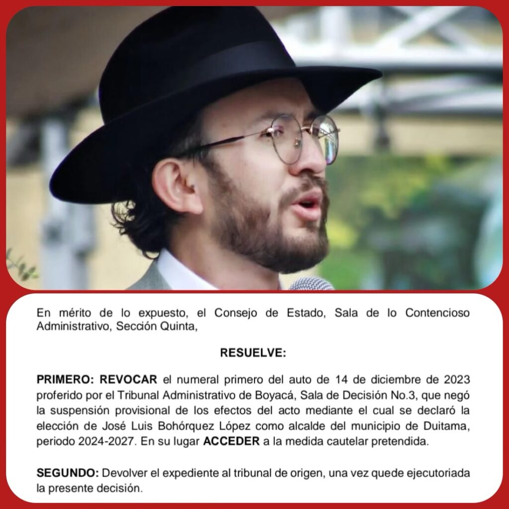 PRIMERO: REVOCAR el numeral primero del auto de 14 de diciembre de 2023 proferido por el Tribunal Administrativo de Boyacá, Sala de Decisión No.3, que negó la suspensión provisional de los efectos del acto mediante el cual se declaró la elección de José Luis Bohórquez López como alcalde del municipio de Duitama, periodo 2024-2027. En su lugar ACCEDER a la medida cautelar pretendida.
